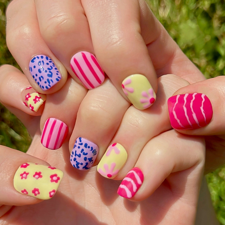 Meet "Candy Safari" - Our Short Round Square-Shaped Nails that are bright, fun, and sassy with a little cute.