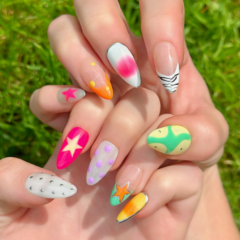 Meet "Cosmic Carnival": These Long Almond nails are the main character with a wild mix of stars, stripes, polka dots, and neon dreams.