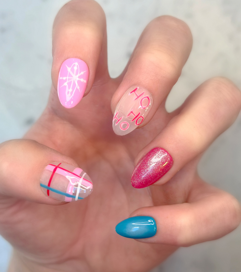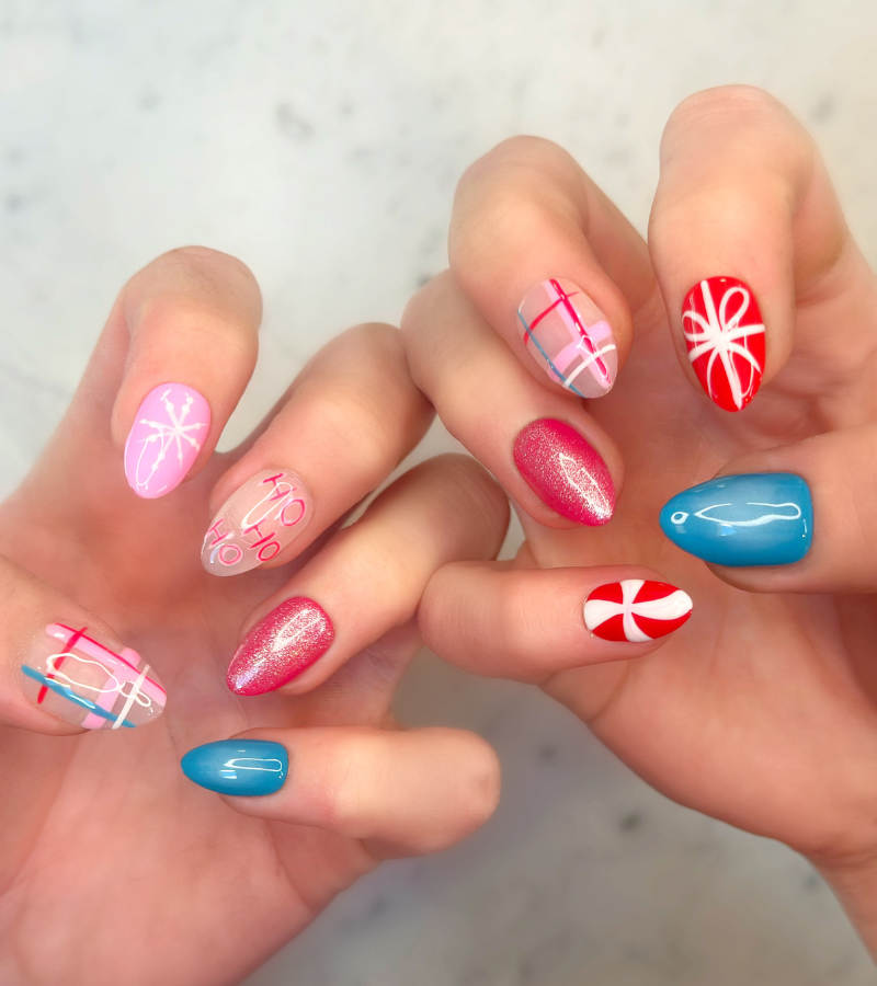 Meet "Christmas is Calling" - A seasonal favorite, these press-ons are a playful mix of bright Christmas vibes with bold plaids, pinks, bows, and candy swirls.
