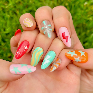 Meet "Electric Summer": Our Long Almond nails with bright bolts, vibrant swirls, and starry vibes to light up your summer.