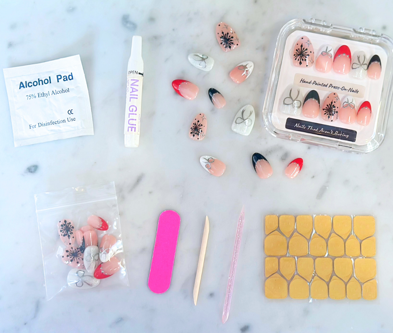 1.) PREP: Prepping is KEY for long-lasting nails. File nails, push back cuticles with included cuticle pusher and wipe down all nails with alcohol pads.