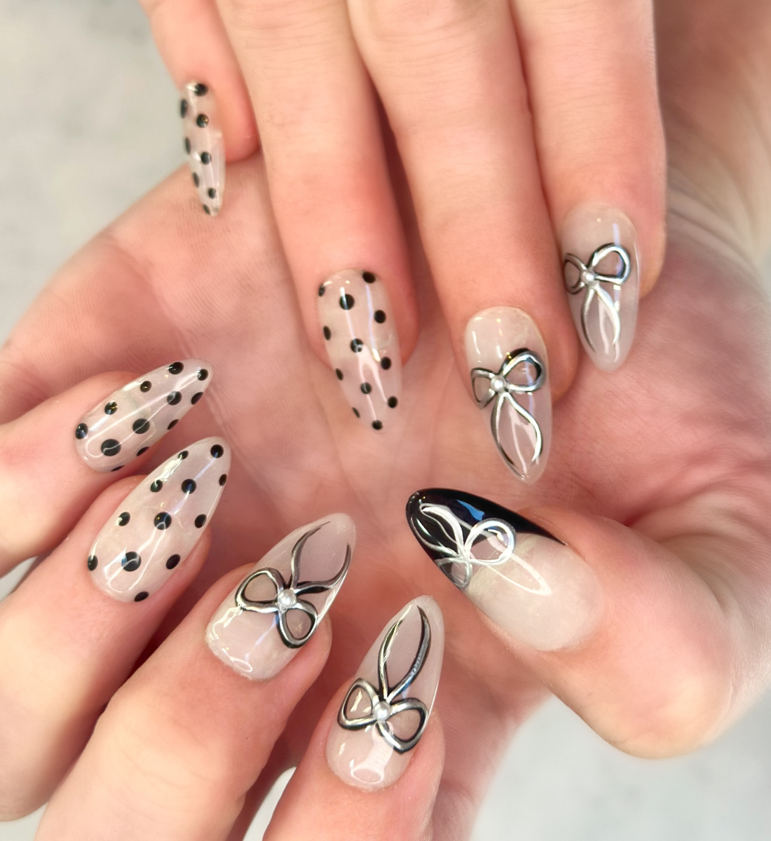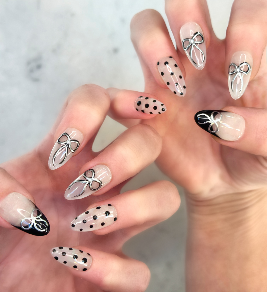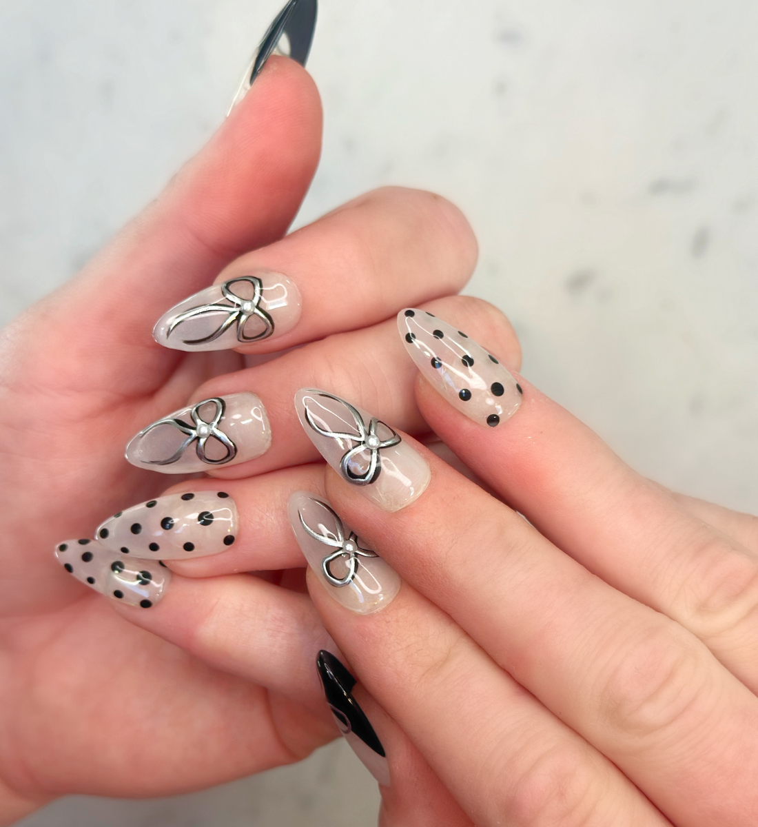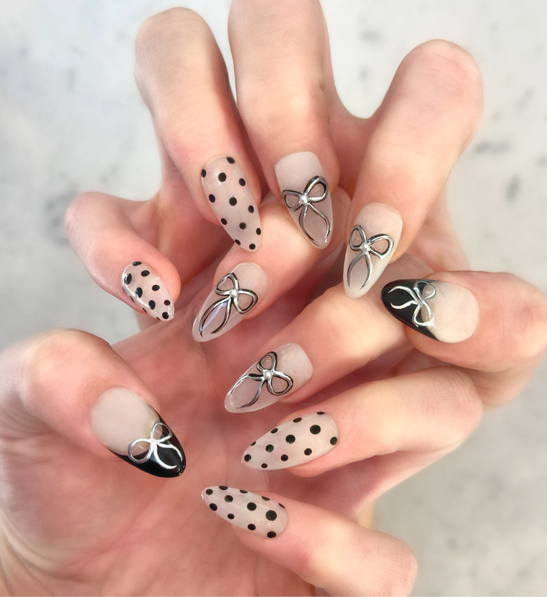 Meet "Silver Ties" - A neutral set featuring sheer nude bases, classic black polka dots, sleek black french tips, and sculpted silver bow accents. Clean, intentional, and undeniably chic.
